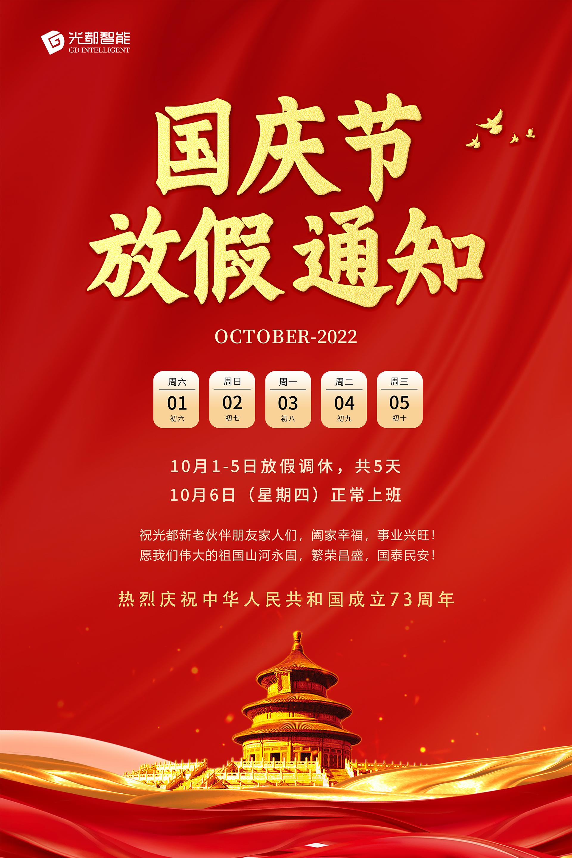 【盛世華誕/歡度國慶】慶祝中華人民共和國成立73周年!祝光都新老伙伴朋友家人們,闔家幸福,事業興旺,國慶快樂!愿偉大祖國山河永固,繁華昌盛,國泰民安!