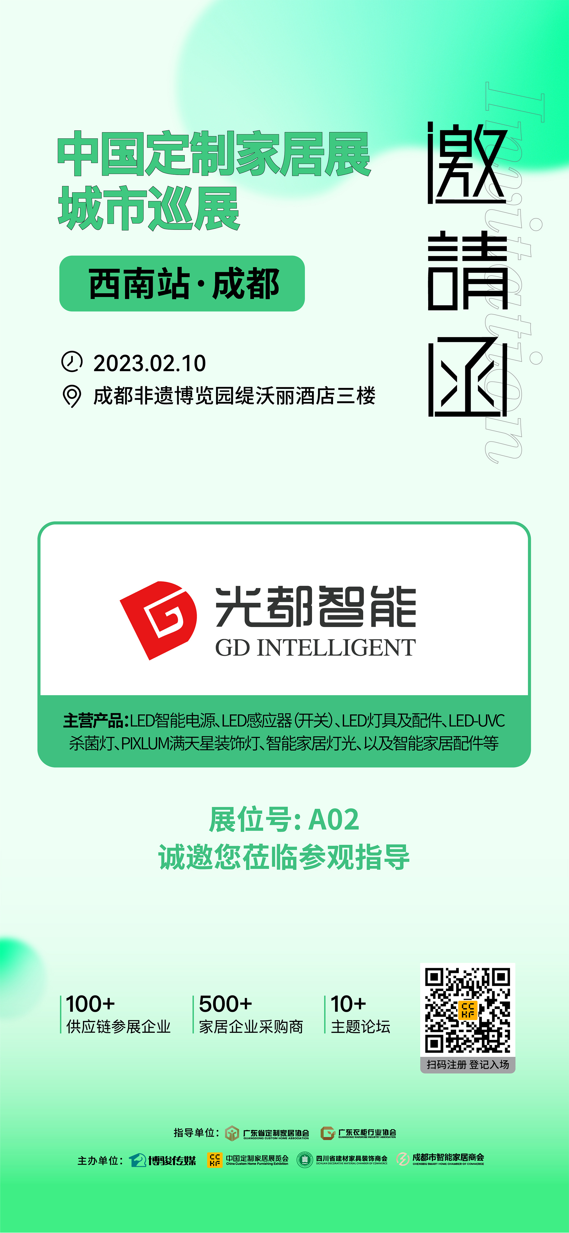 中國定制家居展·城市巡展-成都站暨2022-2023年度中國定制家居產業鏈成都峰會于2023年2月10-11日在成都非遺博覽園緹沃麗酒店盛大舉行,光都展位編號A02,新品綻放,到訪有禮,誠邀您蒞臨參觀指導!參觀登記:https://xz.chfcdu.com/?fr=xzzs